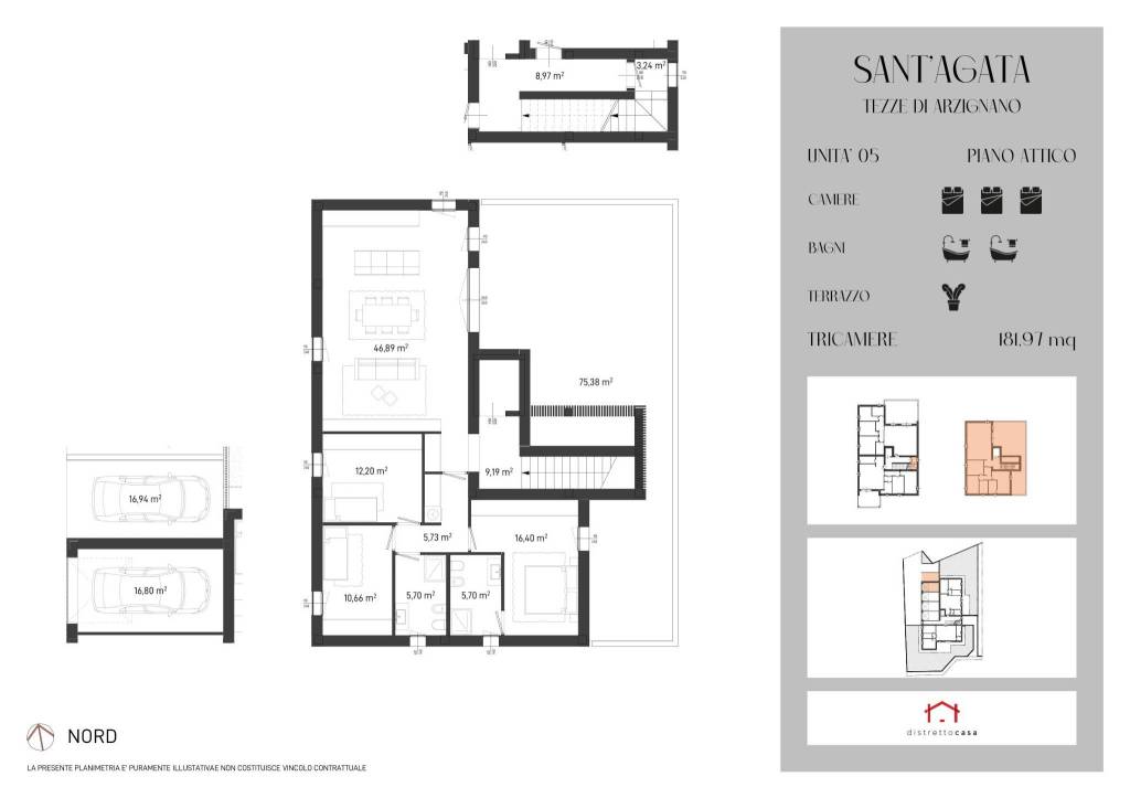 RIF STG/5 : Attico di nuova costruzione composto da zona giorno di 47 mq disimpegno con ascensore privato diretto in appartamento doppi servizi e tre camere da letto. completano la soluzione il gara con un posto auto e la magnifica terrazza.