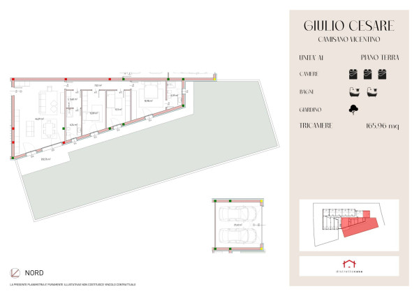 A Camisano Vicentino, in tranquilla zona residenziale, nasce un nuovo ed elegante complesso immobiliare composto da 11 unità abitative, distribuite dal piano terra al primo, secondo e terzo livello. Linee contemporanee, ambienti caldi e dettagli curati danno vita a progetto raffinato, capace di trasformare ogni rientro a casa in un piccolo momento speciale. All’esterno, la tranquillità del quartiere invita a rallentare, mentre la vicinanza ai servizi rende ogni esigenza semplice e immediata. Rif GCS/ A1 Tricamere Piano Terra con ingresso su zona giorno in open – space da ben 46 mq disimpegno ci conduce alla zona notte dove troviamo i due bagni la lavanderia e le tre camere di cui la padronale con il bagno in camere. completano la soluzione un box doppio in larghezza e il giardino di circa 290mq. Distretto Casa presenta un nuovo modo di acquistare la tua nuova casa con uno sconto per i primi 5 clienti che decideranno di opzionare la propria nuova abitazione, tramite la partnership distretto casa e distretto casa agenzie, nasce la nuova opportunità superpromo. Cos’è superpromo? E un opportunita’ che nasce per tutte le famiglie che decidono di affidare l’acquisto piu importante della loro vita al gruppo distretto casa. Come funziona superpromo? Ai primi 5 clienti che sceglieranno di opzionare un abitazione nel residence Giulio Cesare sarà riservato uno sconto pari al 5%.