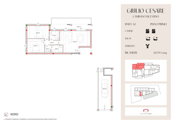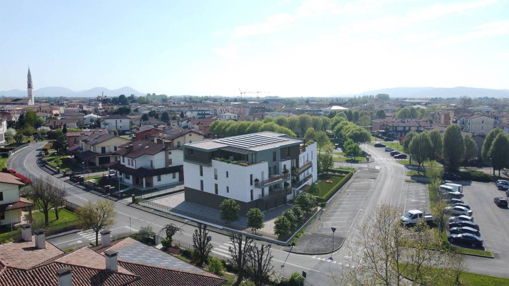A Camisano Vicentino, in tranquilla zona residenziale, nasce un nuovo ed elegante complesso immobiliare composto da 11 unità abitative, distribuite dal piano terra al primo, secondo e terzo livello. Linee contemporanee, ambienti caldi e dettagli curati danno vita a progetto raffinato, capace di trasformare ogni rientro a casa in un piccolo momento speciale. All’esterno, la tranquillità del quartiere invita a rallentare, mentre la vicinanza ai servizi rende ogni esigenza semplice e immediata. Rif GCS/ A2 Bicamere Piano primo con ingresso su zona giorno in open – space di circa 33mq il disimpegno ci conduce alla zona notte dove troviamo le due camere di ampie metrature e i doppi servizi. completano la soluzione una bella terrazza di circa 28mq e il garage dia 30mq Distretto Casa presenta un nuovo modo di acquistare la tua nuova casa con uno sconto per i primi 5 clienti che decideranno di opzionare la propria nuova abitazione, tramite la partnership distretto casa e distretto casa agenzie, nasce la nuova opportunità superpromo. Cos’è superpromo? E un opportunita’ che nasce per tutte le famiglie che decidono di affidare l’acquisto piu importante della loro vita al gruppo distretto casa. Come funziona superpromo? Ai primi 5 clienti che sceglieranno di opzionare un abitazione nel residence Giulio Cesare sarà riservato uno sconto pari al 5%.