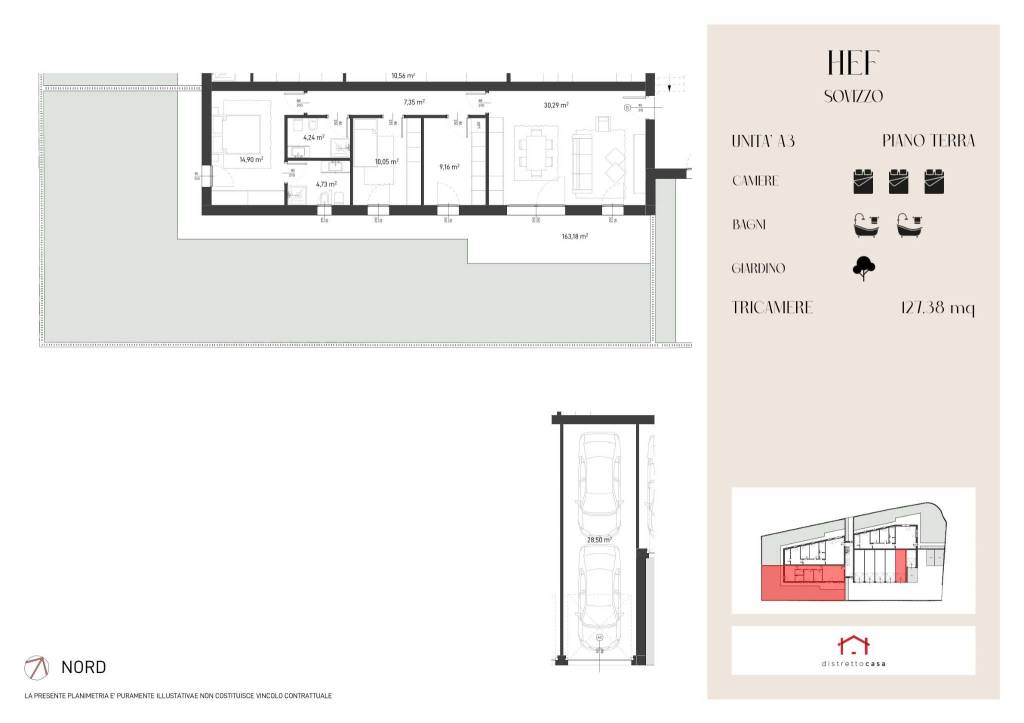 RESIDENCE HEF Nel cuore di Sovizzo, nell’elegante e tranquilla zona di San Daniele, prende vita un nuovo complesso immobiliare pensato per chi desidera qualcosa di più di una semplice casa: un luogo in cui sentirsi davvero al sicuro. Un progetto intimo e riservato, composto da sole 6 unità abitative disposte su due livelli, dove ogni spazio è stato immaginato per offrire armonia, luce e benessere quotidiano. Linee moderne, ambienti accoglienti e dettagli curati creano un’atmosfera raffinata, capace di unire comfort e bellezza in modo naturale. HEF/3 : Tricamere piano terra con giardino da oltre 150Mq. Ingresso su zona giorno in open-space da 30Mq con accesso diretto al giardino tramite porta-finestra. In zona notte troviamo camera matrimoniale con bagno privato, due camere singole e servizio finestrato. Completa la soluzione garage doppio. Distretto Casa presenta un nuovo modo di acquistare la tua nuova casa con uno sconto per i clienti che decideranno di opzionare la propria nuova abitazione prima dell’inizio lavori,tramite la partnership distretto casa e distretto casa agenzie, nasce la nuova opportunità superpromo. Cos’è superpromo? E un opportunita’ che nasce per tutte le famiglie che decidono di affidare l’acquisto piu importante della loro vita al gruppo distretto casa. Come funziona superpromo? Ai clienti che sceglieranno di opzionare un abitazione nel residence HEF prima dell’inizio lavori sarà riservato uno sconto pari al 5%.