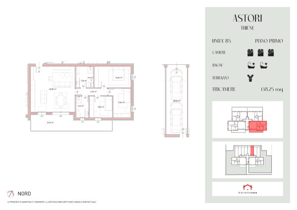 Nel cuore tranquillo di Thiene, dove il ritmo della quotidianità si intreccia con il fascino di un contesto residenziale moderno e riservato, prende vita il Residence Astori: una nuova realizzazione pensata per chi desidera abitare in un luogo capace di coniugare eleganza, comfort e armonia. Il complesso si compone di due raffinate palazzine, intime e curate in ogni dettaglio, che accolgono rispettivamente sette e otto unità abitative. Gli edifici si sviluppano con equilibrio su due e tre livelli, disegnando un’architettura contemporanea che dialoga con l’ambiente circostante e valorizza luce, spazio e vivibilità. A2: Appartamento tricamere al piano primo con terrazza abitabile. Ingresso su zona giorno di 40 mq con uscita su terrazza abitabile di 23 mq. Zona notte composta da tre camere di cui una matrimoniale una doppia ed una singola, il tutto servito da due bagni di cui uno finestrato. A completare la soluzione garage doppio ampio di proprietà. Consegna prevista Marzo 2028 Distretto Casa presenta un nuovo modo di acquistare la tua nuova casa con uno sconto per i primi 7 clienti che decideranno di opzionare la propria nuova abitazione, tramite la partnership distretto casa e distretto casa agenzie, nasce la nuova opportunità superpromo. Cos’è superpromo? E un opportunita’ che nasce per tutte le famiglie che decidono di affidare l’acquisto piu importante della loro vita al gruppo distretto casa.
