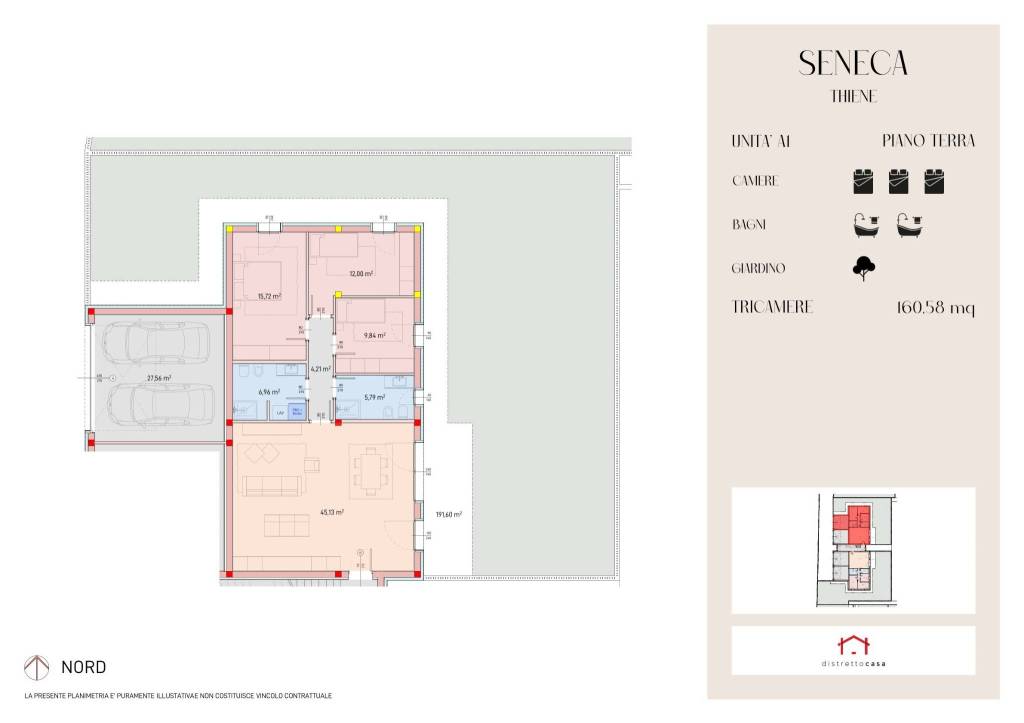 Tricamere al piano terra in classe A4 A Thiene nasce SENECA, residence concepito per offrire un equilibrio perfetto tra eleganza architettonica, comfort abitativo e qualità della vita incastonato all’ interno di una nuova zona residenziale. Il progetto si compone di due raffinate palazzine, armoniosamente inserite nel contesto urbano, rispettivamente di quattro e sei unità abitative distribuite su due livelli. L’architettura contemporanea, caratterizzata da linee pulite ed essenziali, valorizza la luce naturale e crea spazi abitativi luminosi, accoglienti e funzionali. Ampi giardini e terrazze con panorama mozzafiato rendono unico questo contesto. RIF SEN/A1: Appartamento tricamere di oltre 120 mq. Ingresso su zona giorno in open space di 45 mq con accesso diretto a giardino di 200 mq. Zona notte composta da tre camere di cui una matrimoniale, una doppia ed una singola, il tutto servito da due ampi bagni di cui uno finestrato. A completare la soluzione garage doppio in larghezza. Il Gruppo che gestisce Distretto Casa Agenzie nasce nel 2014 e opera sui comuni di Vicenza, Montecchio Maggiore, Trissino, Brogliano, Arzignano, Sovizzo, Creazzo. Altavilla V.na, Monteviale, Costabissara, Montebello Vicentino, Castelgomberto, Cornedo Vicentino, Brendola, Sarego, Chiampo, Torri di Quartesolo, Camisano, Isola Vicentina, Bolzano Vicentino, Grisignano, Thiene, Dueville, Caldogno e Villaverla. Da 2 anni il Gruppo ha aggiunto come territorio operativo anche il Comune di Jesolo per dare un servizio aggiuntivo alla nostra clientela. L’ agenzia è organizzata in 6 sedi operative ed è l’unica ad offrire veramente un servizio a 360°. Mettiamo a disposizione: -Professionisti fortemente specializzati e preparati che grazie all’ esperienza maturata conoscono il mercato immobiliare e tutte le sue normative ma principalmente credono nell’ etica professionale nei confronti del cliente e ne tutelano la riservatezza. -Interior Designer qualificati per la progettazione e la creazione dell’arredamento della tua futura casa. -Consulente Creditizio per la ricerca del mutuo fatto su misura per l’acquisto del tuo futuro immobile. -Tecnici abilitati per verifiche urbanistico catastali e pratiche burocratiche. Il nostro obiettivo è soddisfare tutte le vostre esigenze immobiliari con affidabilità, trasparenza, coerenza e serietà. Se vuoi vendere la tua abitazione o cerchi la tua nuova casa rivolgiti al nostro team di esperti. Ad oggi offriamo più di 250 immobili in vendita., più di 200 immobili compravenduti nell’ultimo anno e il 98% dei nostri clienti soddisfatti. Vieni a trovarci nelle nostre sedi: -Montecchio Maggiore (VI) Viale Europa 57 tel. 0444/602423 -Sovizzo (VI) Via Cavalieri Vittorio Veneto 5 tel. 0444/551722 -Vicenza (VI) Strada Cà Balbi 309 tel. 0444/212088 -Jesolo (VE) Via dei Mille 90 tel. 340/6460474 -Vicenza Ovest – Creazzo (VI) Strada Padana, 16 tel. 04441236092 DISTRETTOCASA AGENZIE, Il gruppo di intermediazione immobiliare che pensa differente.