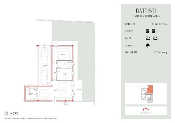 A Torri di Quartesolo prende vita una nuova idea di abitare, dove eleganza contemporanea e comfort quotidiano si intrecciano con naturale armonia. Residence Battisti si distingue per le sue linee pulite e moderne, pensate per dialogare con l’ambiente circostante senza rinunciare a carattere e personalità.Distribuito su quattro livelli, l’edificio accoglie dodici unità abitative, ognuna progettata come un piccolo rifugio privato, luminoso e accogliente. Gli spazi interni si aprono con equilibrio, lasciando entrare la luce naturale che accompagna ogni momento della giornata, creando atmosfere calde e rilassanti. A1: Bicamere Piano terra con giardino composta da ingresso su zona giorno in open space, disimpegno che ci conduce alla zona notte dove troviamo due camere matrimoniali e i doppi servizi. completano la soluzione il giardino e un garage doppio. Consegna prevista Marzo 2028 Distretto Casa presenta un nuovo modo di acquistare la tua nuova casa con uno sconto per i primi 6 clienti che decideranno di opzionare la propria nuova abitazione, tramite la partnership distretto casa e distretto casa agenzie, nasce la nuova opportunità superpromo. Cos’è superpromo? E un opportunita’ che nasce per tutte le famiglie che decidono di affidare l’acquisto piu importante della loro vita al gruppo distretto casa.