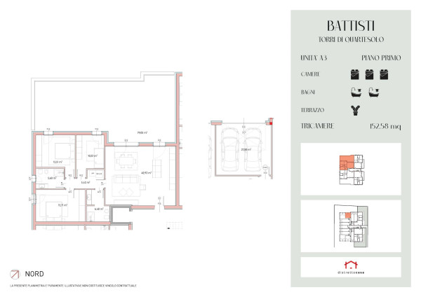 A Torri di Quartesolo prende vita una nuova idea di abitare, dove eleganza contemporanea e comfort quotidiano si intrecciano con naturale armonia. Residence Battisti si distingue per le sue linee pulite e moderne, pensate per dialogare con l’ambiente circostante senza rinunciare a carattere e personalità.Distribuito su quattro livelli, l’edificio accoglie dodici unità abitative, ognuna progettata come un piccolo rifugio privato, luminoso e accogliente. Gli spazi interni si aprono con equilibrio, lasciando entrare la luce naturale che accompagna ogni momento della giornata, creando atmosfere calde e rilassanti. A3: Tricamere Piano primo con terrazza da 80mq composta da ingresso su zona giorno in open space, disimpegno che ci conduce alla zona notte dove troviamo tre camere matrimoniali e i doppi servizi. completa la soluzione un garage doppio. Consegna prevista Marzo 2028 Distretto Casa presenta un nuovo modo di acquistare la tua nuova casa con uno sconto per i primi 6 clienti che decideranno di opzionare la propria nuova abitazione, tramite la partnership distretto casa e distretto casa agenzie, nasce la nuova opportunità superpromo. Cos’è superpromo? E un opportunita’ che nasce per tutte le famiglie che decidono di affidare l’acquisto piu importante della loro vita al gruppo distretto casa.