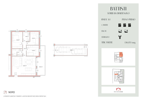 A Torri di Quartesolo prende vita una nuova idea di abitare, dove eleganza contemporanea e comfort quotidiano si intrecciano con naturale armonia. Residence Battisti si distingue per le sue linee pulite e moderne, pensate per dialogare con l’ambiente circostante senza rinunciare a carattere e personalità.Distribuito su quattro livelli, l’edificio accoglie dodici unità abitative, ognuna progettata come un piccolo rifugio privato, luminoso e accogliente. Gli spazi interni si aprono con equilibrio, lasciando entrare la luce naturale che accompagna ogni momento della giornata, creando atmosfere calde e rilassanti. A3: Tricamere Piano primo con terrazza da 20mq composta da ingresso su zona giorno in open space, disimpegno che ci conduce alla zona notte dove troviamo tre camere matrimoniali e i doppi servizi. completa la soluzione un garage doppio. Consegna prevista Marzo 2028 Distretto Casa presenta un nuovo modo di acquistare la tua nuova casa con uno sconto per i primi 6 clienti che decideranno di opzionare la propria nuova abitazione, tramite la partnership distretto casa e distretto casa agenzie, nasce la nuova opportunità superpromo. Cos’è superpromo? E un opportunita’ che nasce per tutte le famiglie che decidono di affidare l’acquisto piu importante della loro vita al gruppo distretto casa.