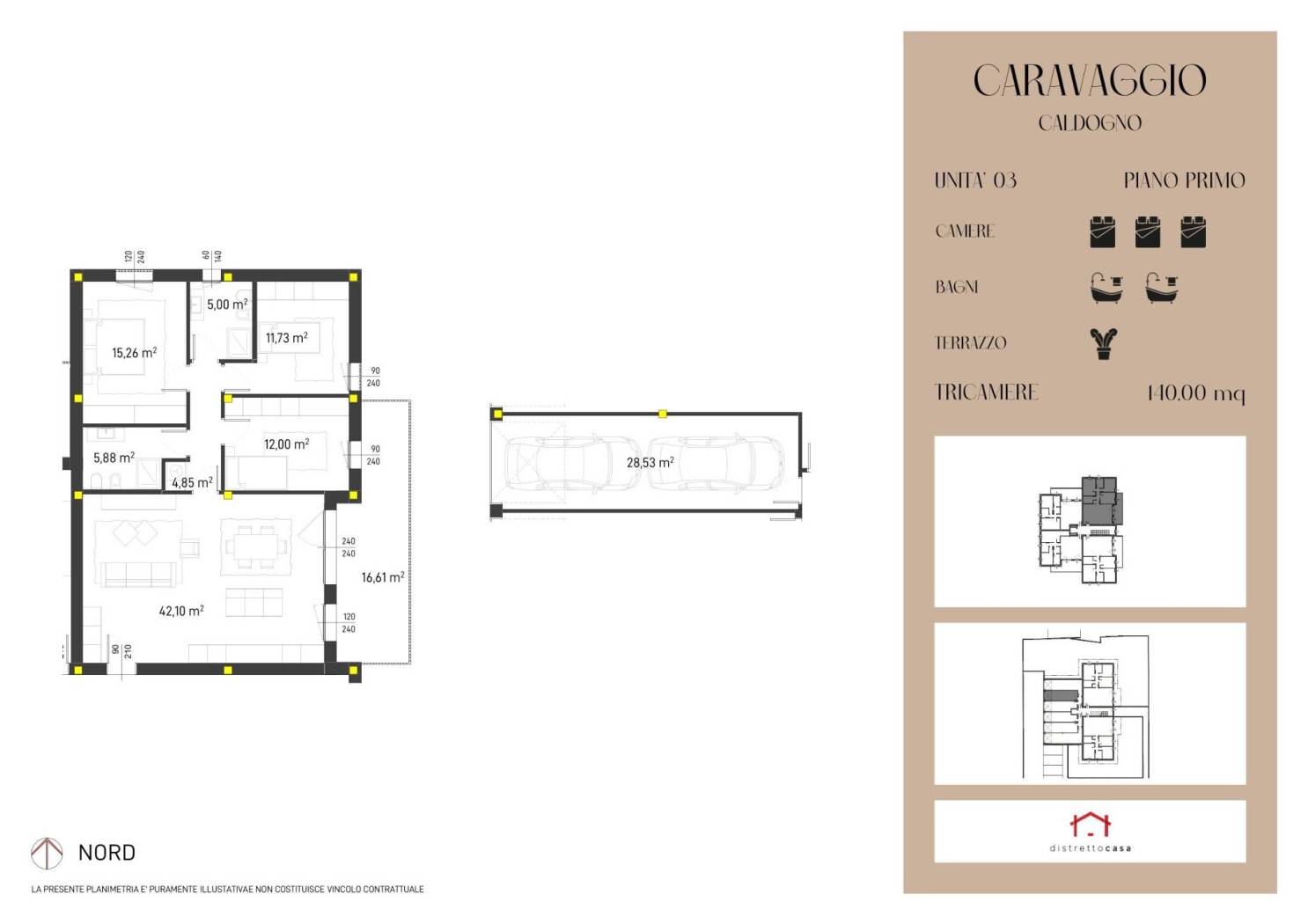 I garage fuori terra assicurano comodità e sicurezza, mentre ampi terrazzi abitabili e giardini privati regalano spazi preziosi dove rilassarsi, coltivare le proprie passioni o semplicemente godersi un raggio di sole in totale tranquillità. Rif CAR/3:Appartamento tricamere al piano primo.Cucina e soggiorno open space con accesso a terrazzo esterno. 3 camere e doppio servizio.Completa la soluzione un garage doppio in lunghezza.