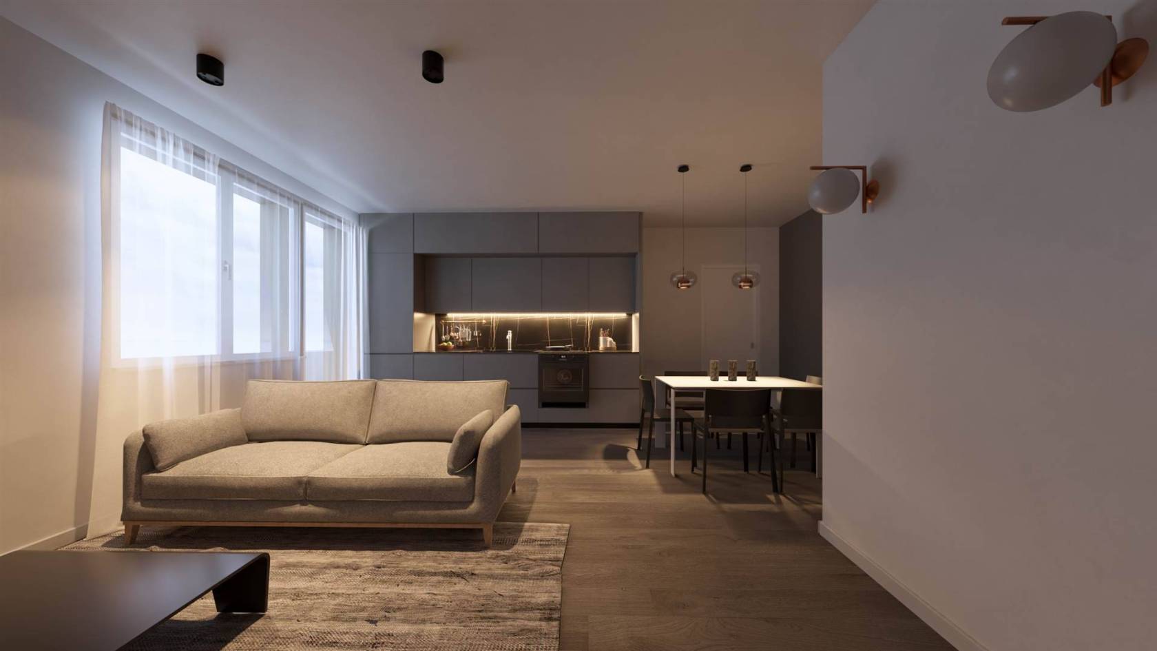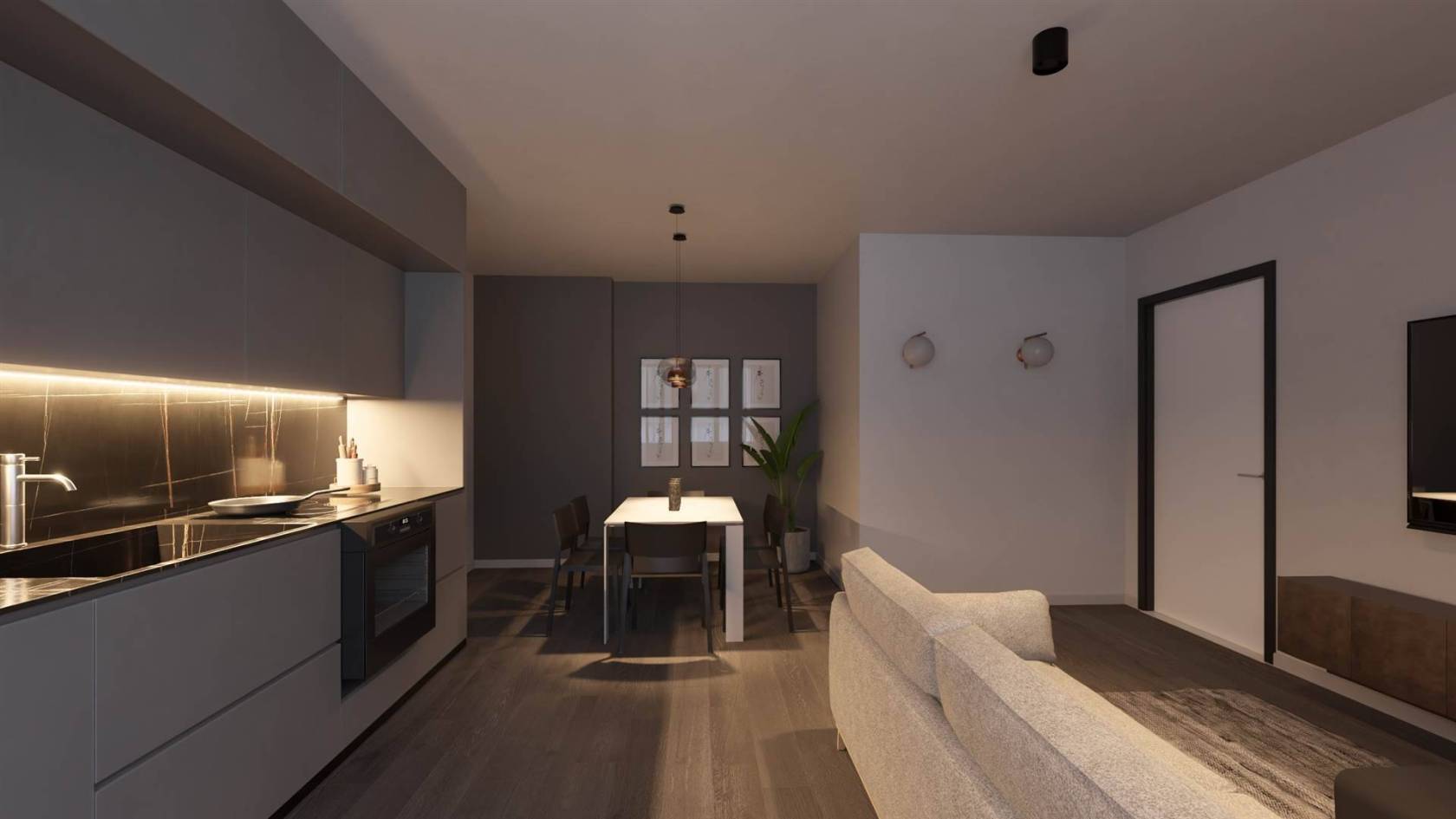 Cucina e soggiorno da 31 mq. Bagno finestrato e due camere da letto.