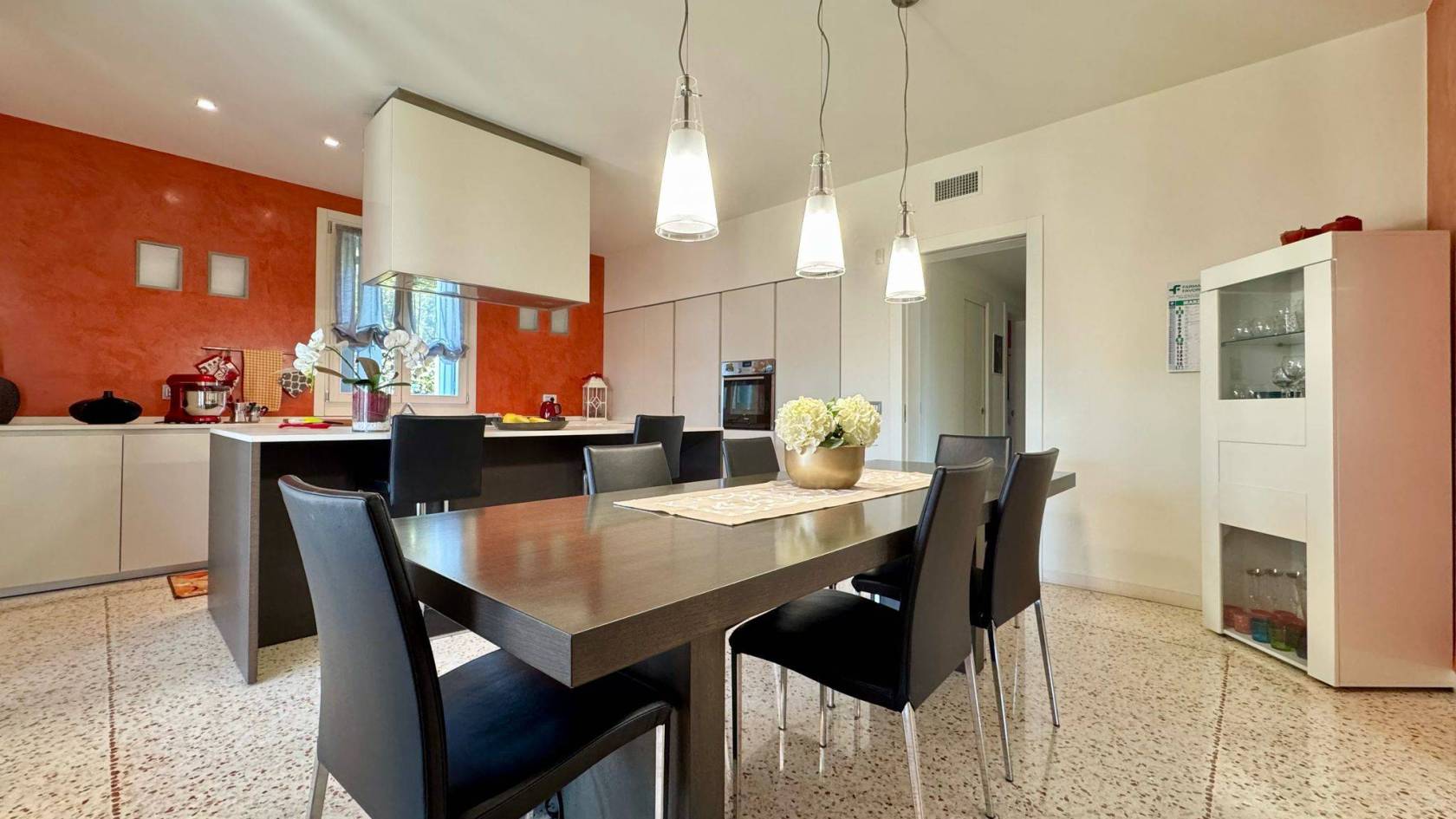 Al piano primo si sviluppa la zona notte con tre camere da letto, uno studio e un ulteriore bagno. Completa la proprietà un ampio garage doppio e una taverna al piano interrato.