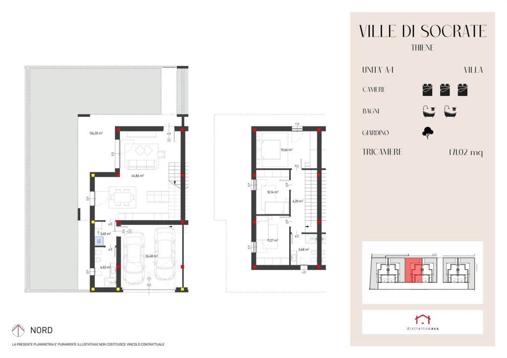 Inserite in una nuova e prestigiosa area residenziale di Thiene prende vita un progetto abitativo pensato per chi desidera distinguersi. Eleganti ville bifamiliari disposte su due livelli, caratterizzate da un’architettura contemporanea che interpreta un modo moderno di vivere la casa, dove estetica e praticità si incontrano. Un progetto esclusivo, dove qualità costruttiva, tecnologia e cura dei dettagli si incontrano per creare abitazioni moderne, eleganti e senza tempo. SOC/04 : Porzione di bifamiliare con importante zona giorno da 45 mq. Bagno di servizio zona giorno con lavanderia. Ampio giardino da oltre 135 mq con vista aperta. Camera padronale con cabina armadio da oltre 16 mq ,due camere singole, bagno finestrato in zona notte. Completa la soluzione garage doppio. Distretto Casa presenta un nuovo modo di acquistare la tua nuova casa con uno sconto per i primi 3 clienti che decideranno di opzionare la propria nuova abitazione, tramite la partnership distretto casa e distretto casa agenzie, nasce la nuova opportunità superpromo. Cos’è superpromo? E un opportunita’ che nasce per tutte le famiglie che decidono di affidare l’acquisto piu importante della loro vita al gruppo distretto casa. Come funziona superpromo? Ai primi 3 clienti che sceglieranno di opzionare un abitazione nel residence Socrate sarà riservato uno sconto pari al 5%. Classe Energetica: A4